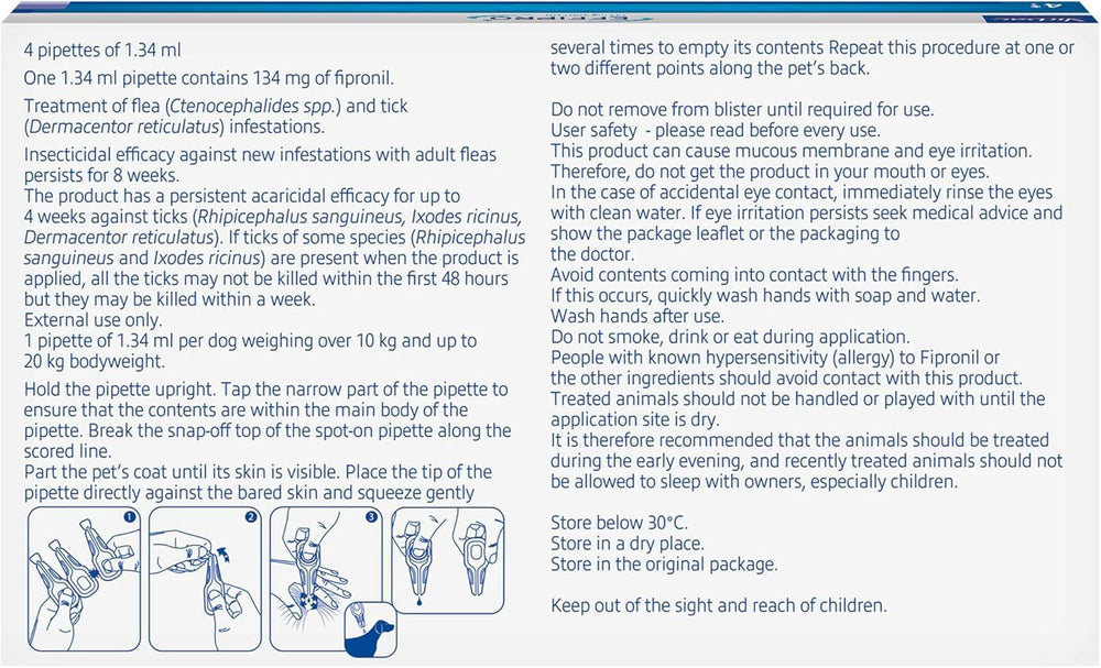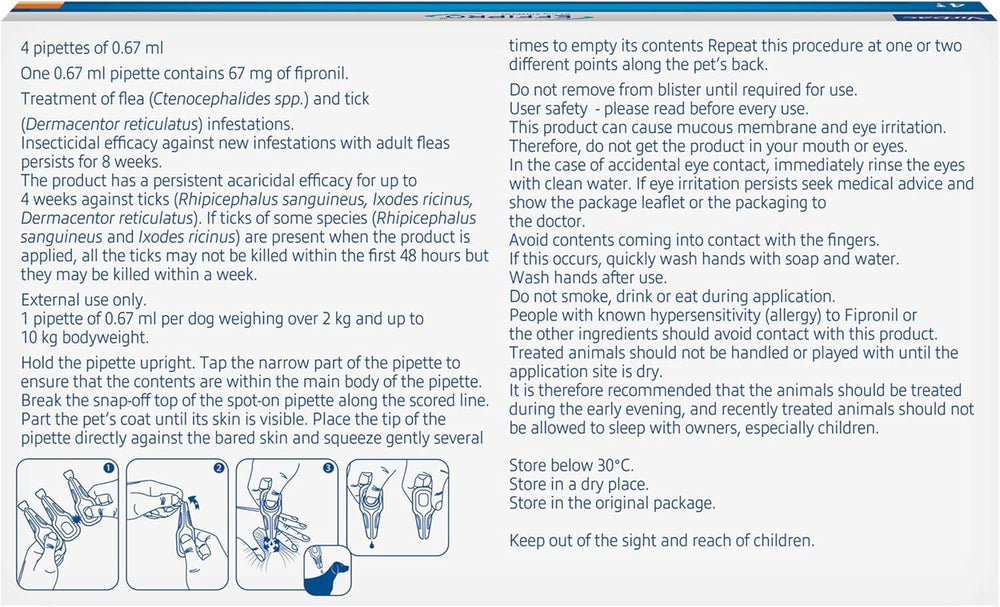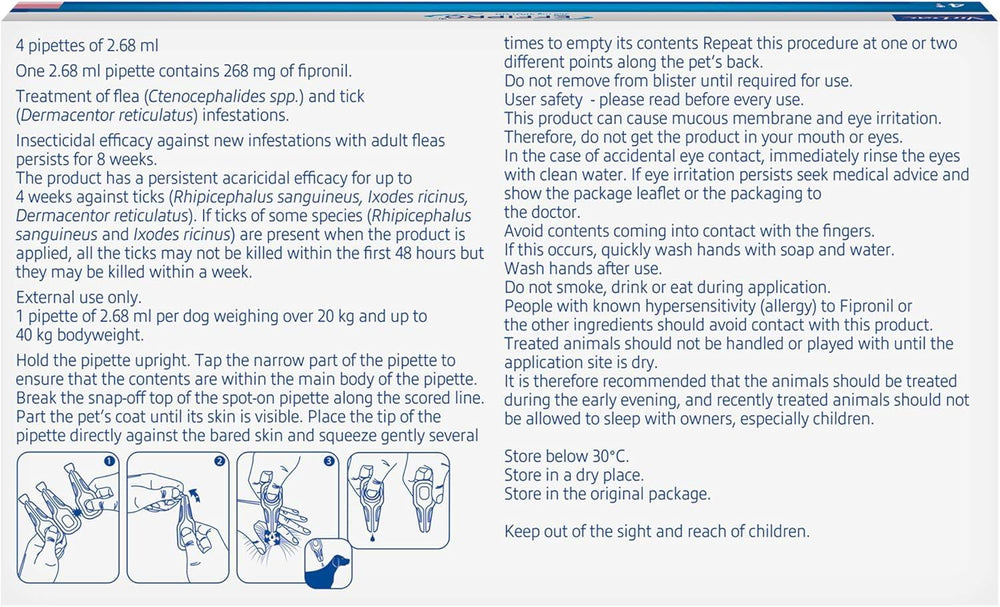 Effipro is a spot-on with a difference. Its unique, award-winning 'droplock' technology makes application simple - the solution is released only when you are ready and you have precise finger tip control throughout application. This means no leaks, no mess and the solution on your pet’s skin, not your hands! As effective as the market leader, Effipro is offered in value packs of four, making it the affordable way to make flea control simple. It contains trusted fast acting fipronil which will kill fleas on your pet within 24 hours, and ticks within 48 hours.
